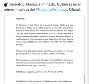 Cerca del mediodía, el Tribunal de Disciplina del Consejo Federal emitió el fallo del partido del pasado domingo entre Atlético Alianza y Gutiérrez de Mendoza, suspendido en el entretiempo por el árbitro a raíz de algunos incidentes dentro del vestuario visitante.
