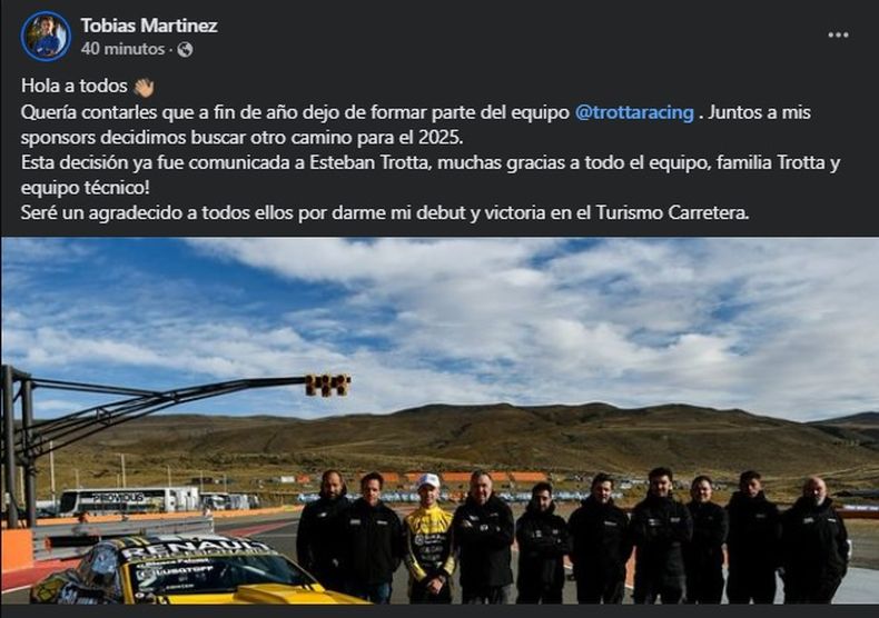 Hola a todos Quería contarles que a fin de año dejo de formar parte del equipo @trottaracing. Juntos a mis sponsors decidimos buscar otro camino para el 2025. Esta decisión ya fue comunicada a Esteban Trotta, muchas gracias a todo el equipo, familia Trotta y equipo técnico! Seré un agradecido a todos ellos por darme mi debut y victoria en el Turismo Carretera.
