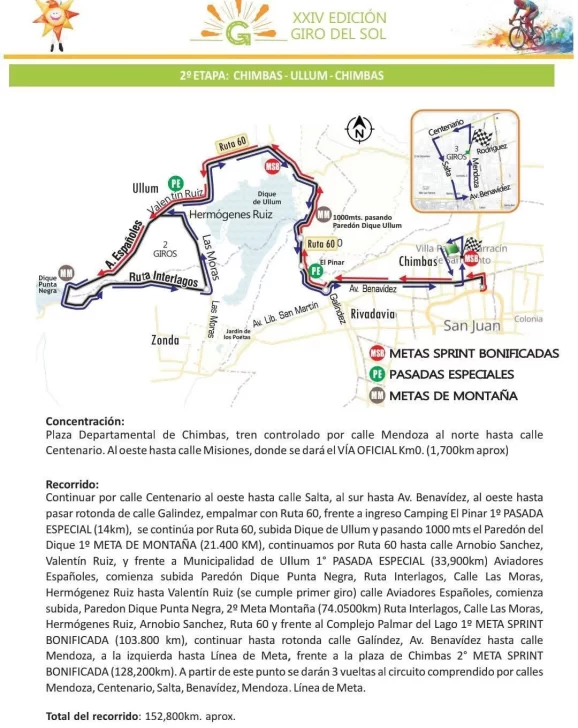 Es una carrera especial por muchas razones. Un gran aperitivo para la Vuelta de San Juan pero además, un diseño que elige todas las alternativas porque tiene la planicie el Este sanjuanino con Caucete, San Martín, Angaco y Albardón para pasar luego a la temida trepada de Punta Negra y el electrizante circuito de Chimbas. Luego, el esfuerzo individual en la contrarreloj desde Ullum al mismo dique ullunero y de postre, la excursión por el Sur con Pocito a la cabeza para cerrarlo.