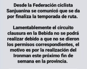 El Ironman a realizarse este fin de semana y que recorrerá el Oeste sanjuanino será uno de los impedimentos para la realización de la competencia. Y de reprogramarse, el fin de semana del 13 y 14 de abril ese fin de semana se realizará el Campeonato Argentino de Ruta en Córdoba, por lo tanto tampoco sería posible.