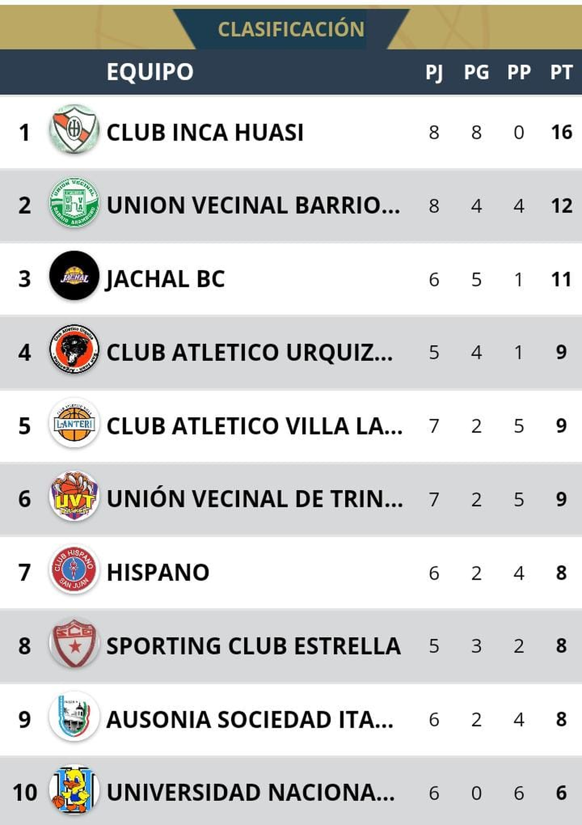 Inca Huasi derrotó como visitante a UVT por 65 a 55. El Ñokaico tuvo como figura a Francisco Palacio que sumó 16 puntos. Nahuel Hogalde fue el mejor de los locales con 19 unidades y jugó los 40 minutos del partido. El equipo del Parque de Mayo acumula 8 triunfos en 8 presentaciones.