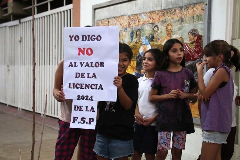 El reclamo se llevó a cabo en la tarde del lunes en Avenida Libertador y Mendoza, y luego se trasladó a las afueras del ente que regula el hockey sobre patines de San Juan, ubicado sobre calle Maipú. Con carteles -uno de ellos decía “No al valor de la licencia 2024”- los papás y sus hijos pidieron por una rebaja en el monto a depositar.