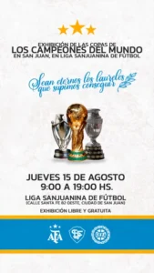 “Las Copas de los Campeones del Mundo visitan la Liga Sanjuanina de Fútbol”, así expusieron en un comunicado. El evento contará con la presencia de la Copa del Mundo, de la Copa Finalissima y la Copa América.