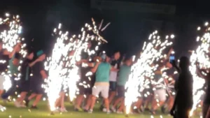 Sobre las 21:30 hs., el colectivo que trasladaba al equipo arribó al estadio en medio de una ovación de la marea verdinegra. Tras saludar a familiares y amigos en abrazos cargados de emoción, el plantel ingresó a la cancha. Las luces se apagaron y fue el momento en el que los fuegos artificiales iluminaron el cielo.