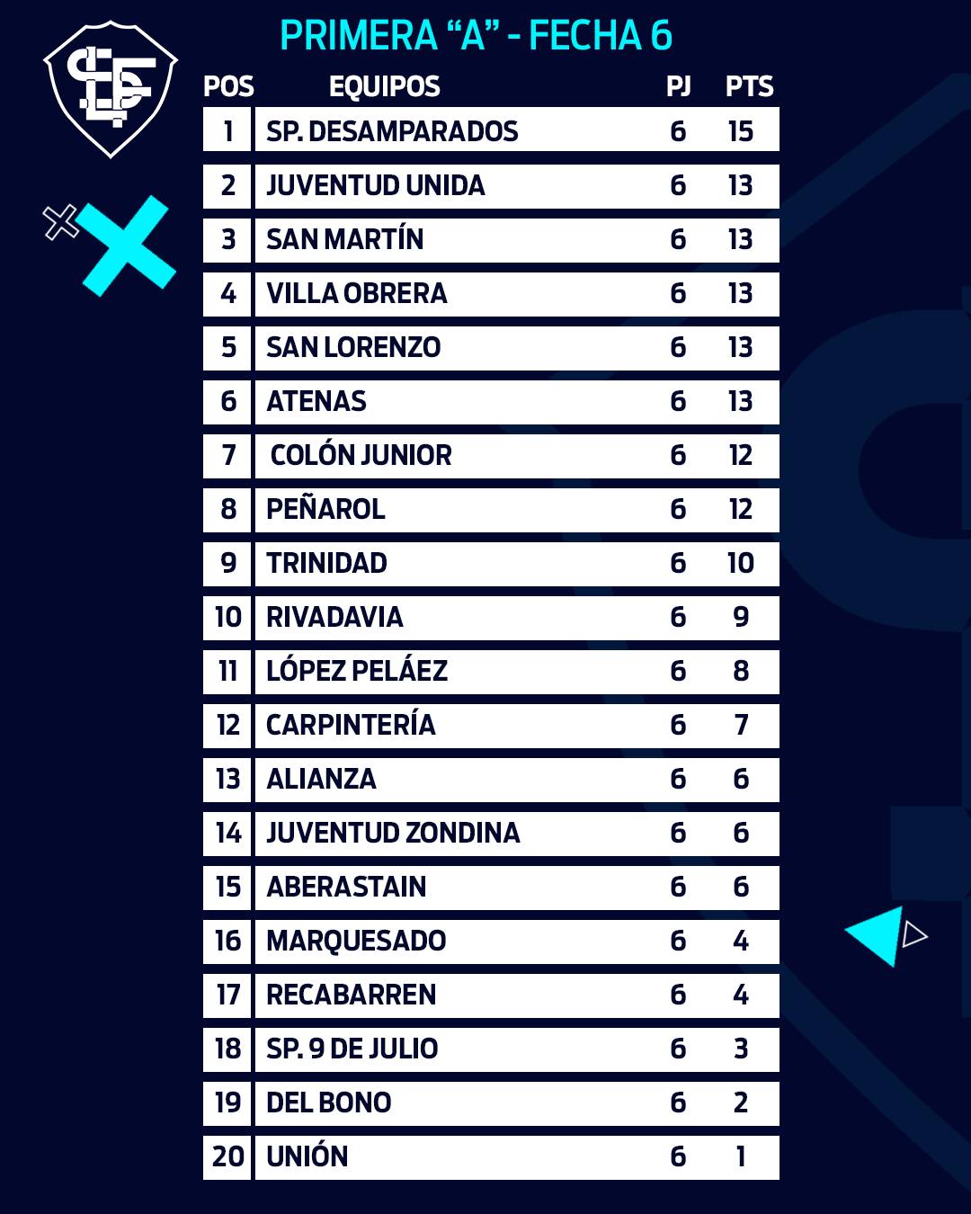 Los otros resultados de este domingo fueron los siguientes: Atenas 2-1 9 de Julio, Villa Obrera 2-0 Unión, Aberastain 1-0 López Peláez, Carpintería 1-0 Alianza y Rivadavia 2-0 Marquesado en el clásico.