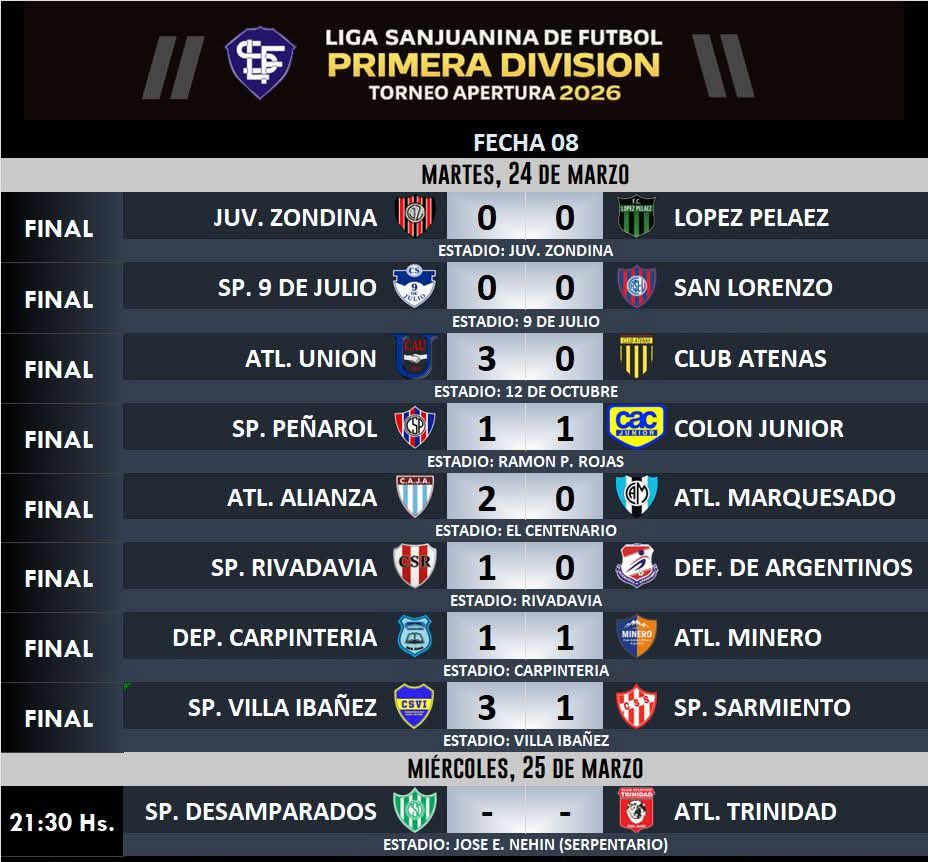 Martes de mucha acción en el fútbol sanjuanino, ya que se jugaron ocho partidos correspondientes a la octava fecha del torneo Apertura de la Liga Sanjuanina de Fútbol. Sin dudas el epicentro estuvo en el 12 de Octubre de Villa Krause, donde Unión se recuperó del traspié frente a San Lorenzo y volvió a tomar la cima del campeonato.