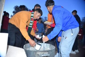 Mientras algunos de los jugadores preparaban el chocolate, otros aprovechaban para jugar un “picadito” con los pequeños del lugar.