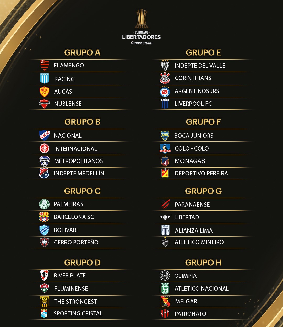 En cambio, Racing y River no pudieron evitar cruzarse con los brasileños. La Academia enfrentará a Flamengo, Aucas y Ñublense en el A, mientras que el Millonario será cabeza del D ante Fluminense, The Strongest y Sporting Cristal.