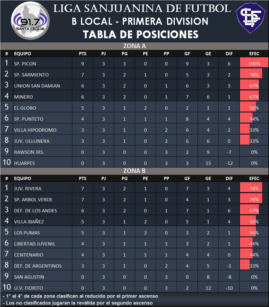 En la Zona A, Villa Hipódromo consiguió los primeros tres puntos del torneo al ganarle a Rawson Junior que sigue sin sumar, además, en otro partido, El Globo y Sarmiento de Zonda repartieron puntos en reducto del equipo de Rivadavia. Mientras que en el choque de equipos invictos, Picón venció a Minero Argentino y quedó como único líder.