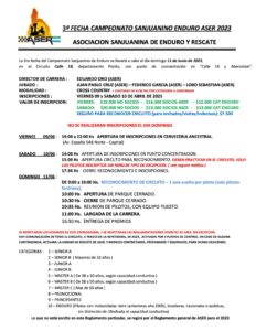 Este fin de semana se disputará la 3° fecha del Campeonato Sanjuanino de Enduro, organizado y fiscalizado por ASER, Asociación Sanjuanina de Enduro y Rescate. Con punto de concentración en Calle 18 a Aberastain, la competencia largará a las 11 hs del próximo domingo 11 de Junio. Previamente, el viernes 9 se realizarán las inscripciones de 19 a 22 hs, mientras que el sábado, desde las 15 hs, se realizará el reconocimiento del circuito para los pilotos inscriptos.